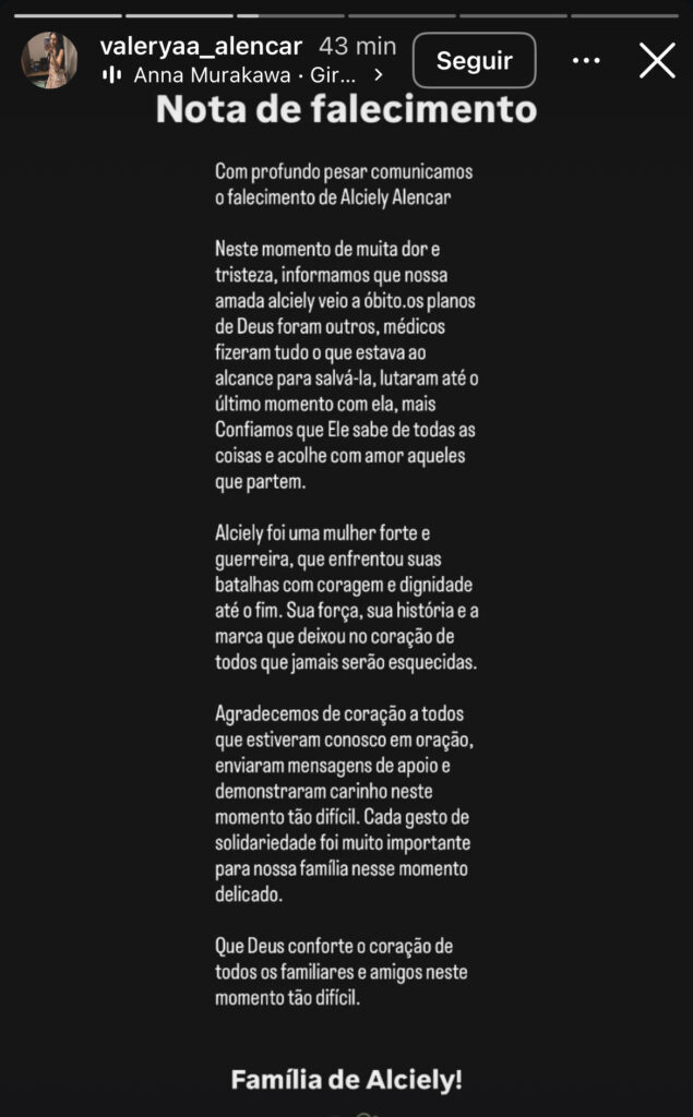 “Alciely foi uma mulher forte e guerreira, que enfrentou suas batalhas com coragem e dignidade até o fim”, diz a mensagem divulgada.